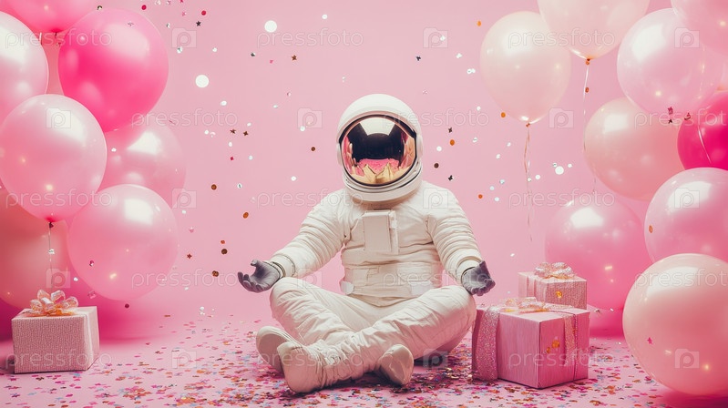 Капризный астронавт в окружении праздничных воздушных шаров и подарков, идеально подходит для веселых и творческих проектов