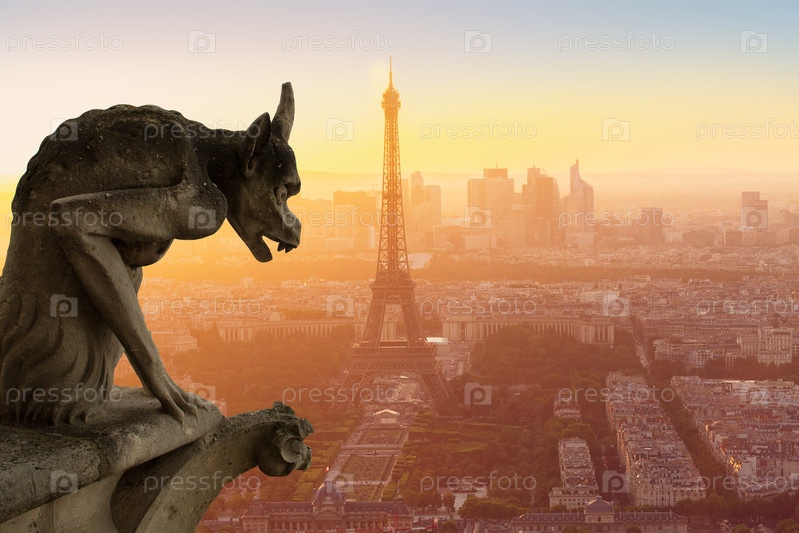 Парижская горгулья на соборе Нотр-Дам и городской пейзаж Парижа сверху на закате, Франция