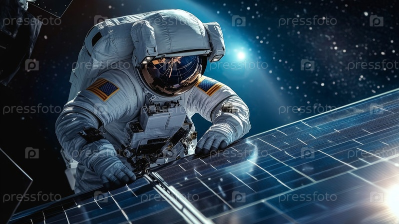 Астронавт обслуживает профессиональную солнечную электрическую панель, Земля на заднем плане