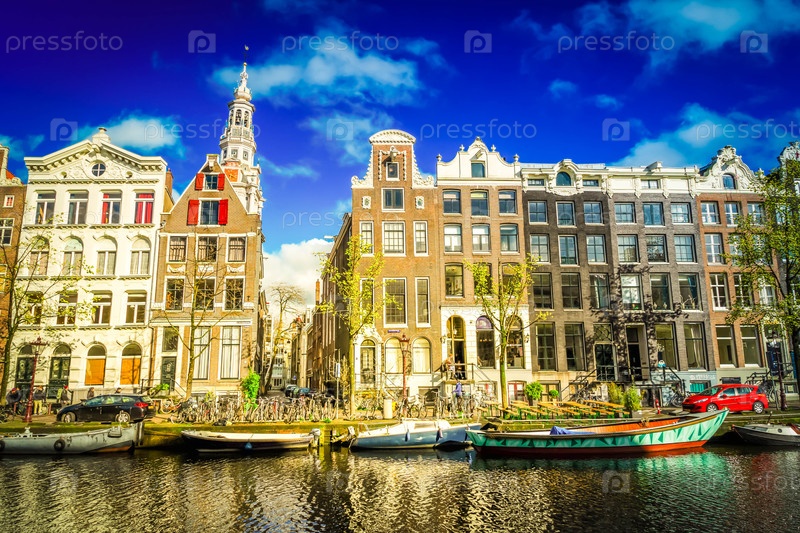 Фасады домов над водой из канала, Амстердам, Нидерланды