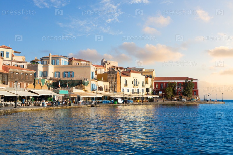Венецианская гавань Хании с историческими домами в солнечный день, Крит, Греция