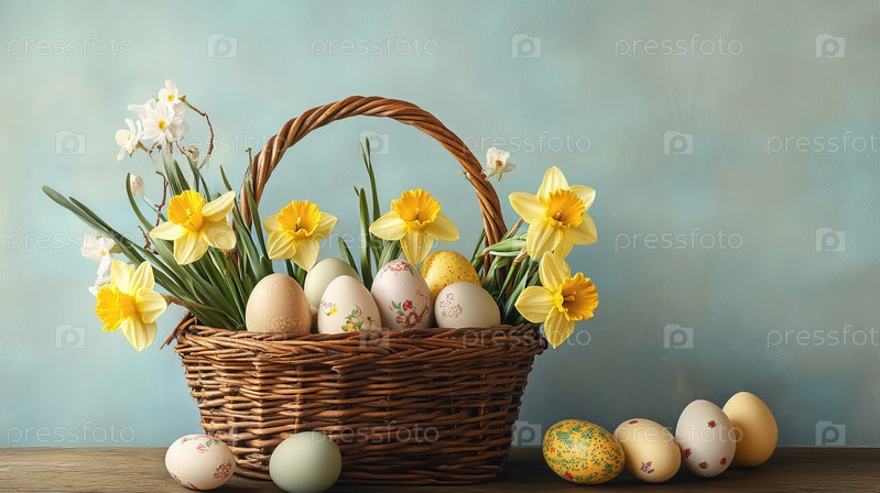 Корзина с пасхальными яйцами и цветами нарцисс,