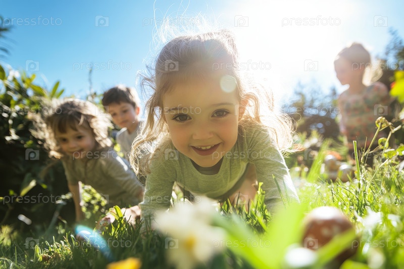 Дети участвуют в охоте на пасхальные яйца в солнечном саду