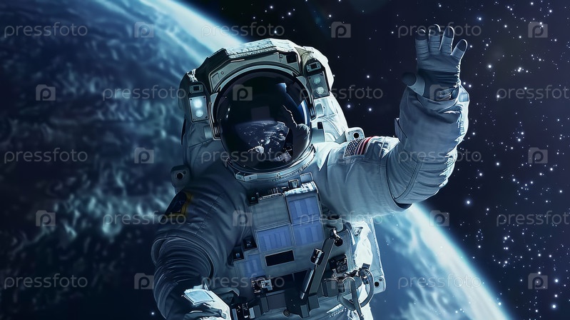 Космонавт в космическом пространстве машет правой рукой в знак приветствия