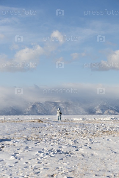 Одинокий человек на озере Байкал на фоне гор