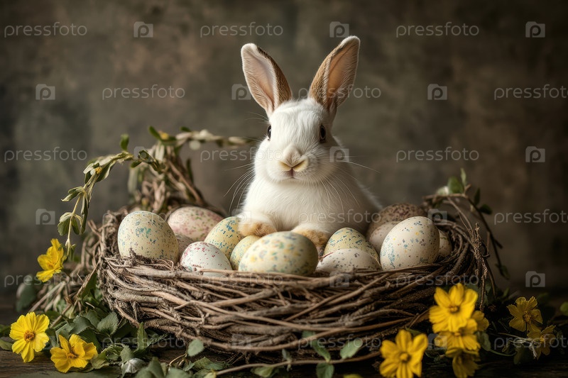 Крошечный желтый цыпленок, расположенный в гнезде среди маргариток и пятнистых яиц, мягкий солнечный свет подчеркивает пушистое дно, росовые стебли и нежное пастырское настроение, макро-круглометраж