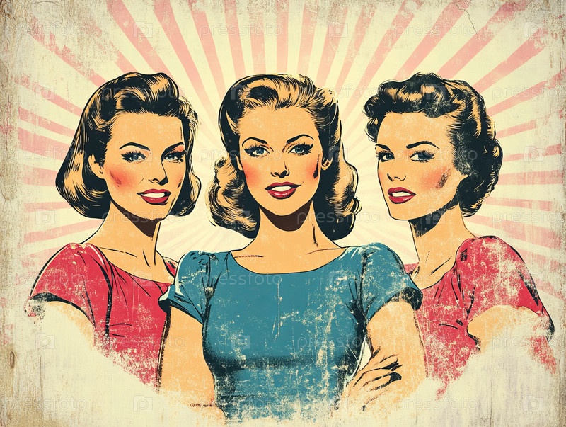 Три женщины, стоящие рядом с решительными улыбками, концентрические лучи и ретро-палитра символизируют сеть поддержки противостоящей раковым клеткам эмоциональной группы