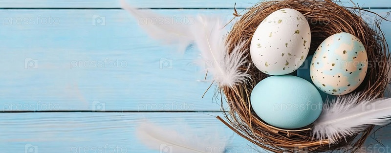Пасхальные яйца, перья в гнезде на голубом деревянном фоне, копировальное пространство