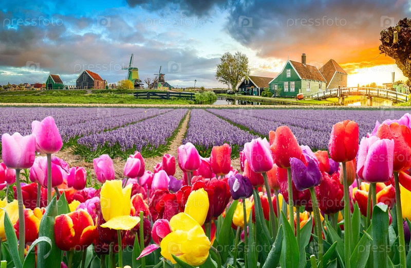 Традиционные голландские ветряные мельницы Заансе-Шана над водой на летнем закате, Нидерланды