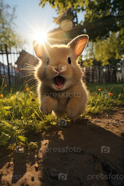 Кролик бежит по газону на фоне солнечной лужайки,