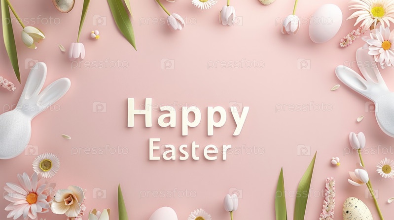 Модный пасхальный дизайн с типографией, кроликами, цветами, яйцами, ушами кролика в пастельных тонах