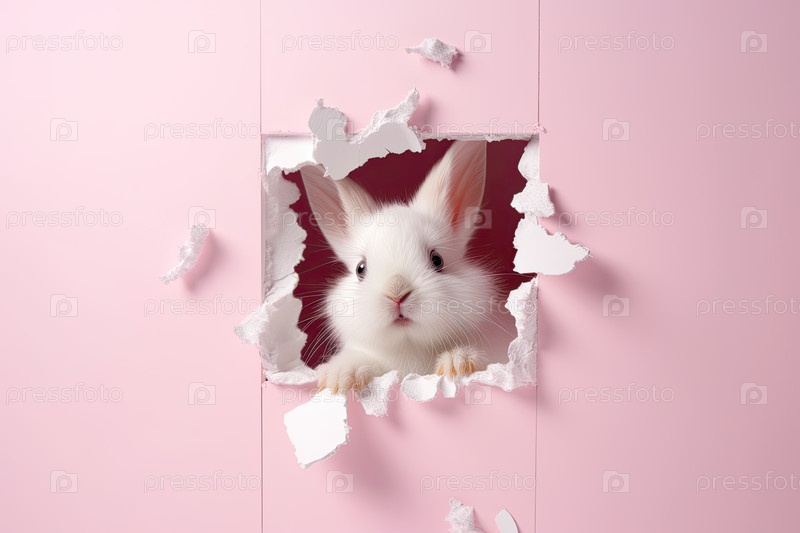 Милый счастливый пушистый белый пасхальный кролик заглядывает из дыры в светло-розовой стене, зайчик выпрыгивает из разорванного отверстия