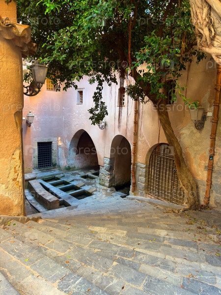 Старый средневековый стиральный дом Cefalu, датированный 1514 годом, с оригинальными каменными раковинами и чугунными ротками, Сицилия Италия