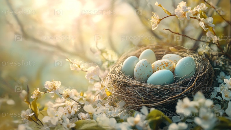 Рама с белыми и синими пятнистыми пасхальными яйцами и вишневыми цветами на светло-синем фоне. Концепция "Счастливого Пасхи". Простой весенний шаблон