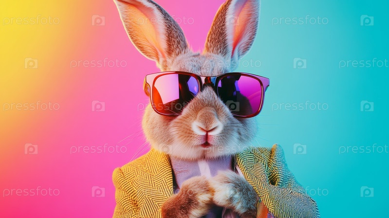 Стильный кролик, уверенно одетый в красочную одежду и шикарные солнцезащитные очки. модный зайчик, одетый в яркую одежду, дополненную модными очками на живом фоне