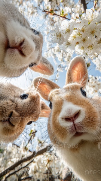 Группа пушистых кроликов с длинными ушами среди красочных весенних цветов захватывает причудливую сцену