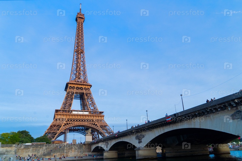 Эйфелева башня и Пон-Диена в синий сумерки, Париж Франция