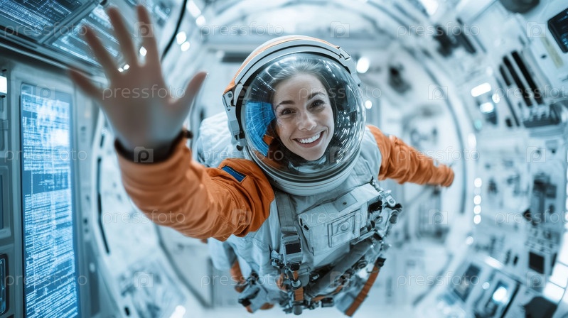 Радостная астронавтка в новаторской космической станции, демонстрируя чудеса исследования космоса