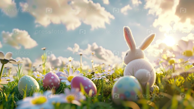 Пасхальный пейзаж, кролики с красочными яйцами и ромашками на лугу под прекрасным небом