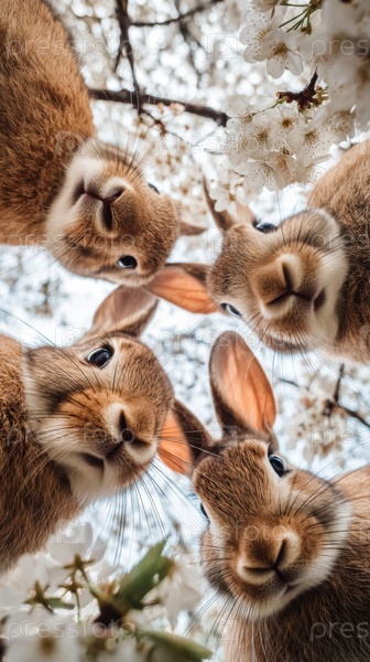 Очаровательная сцена кроликов в солнечной цветочной обстановке Интимная фотография, захватывающая игривых кроликов среди ярких весенних цветков и яркого солнечного света