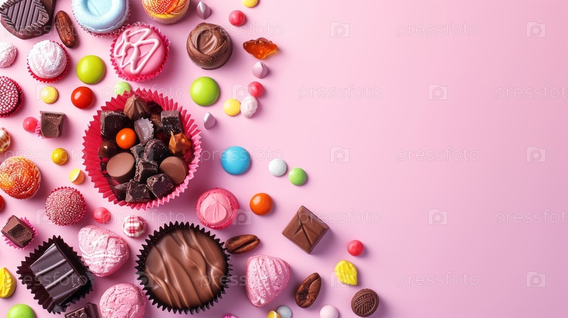 Ассортимент вкусного шоколада, конфет и красочных сладостей на светло-розовом фоне