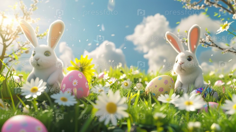 Пасхальный пейзаж, кролики с красочными яйцами и ромашками на лугу под прекрасным небом