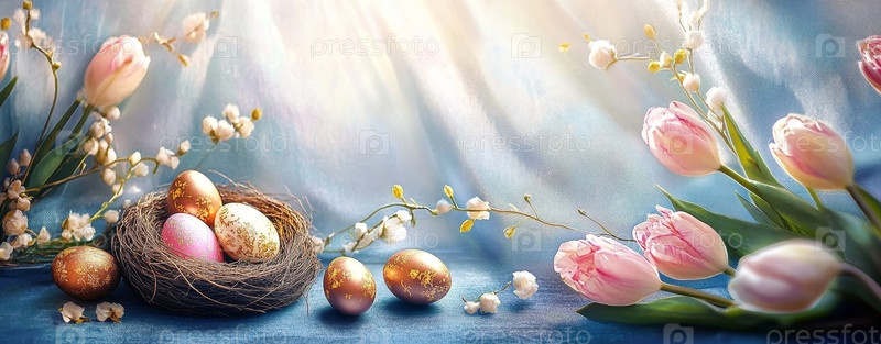 Роскошный цветочный весенний дисплей. Софистицированное весеннее расположение с нежными цветами. Изысканная сезонная декорация, включающая элегантные цветы и тонкие блестящие акценты