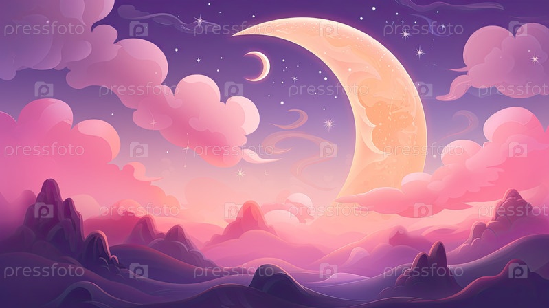 Большой полумесяц луны на фоне ночи, в стиле мультфильма