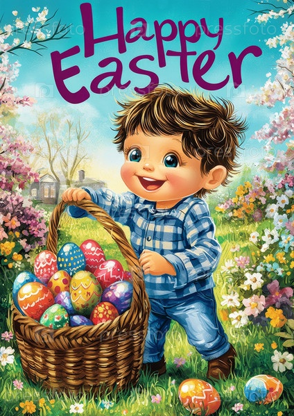 Милый ребенок с корзиной, полной красочных пасхальных яиц, играет в траве, винтажная открытка