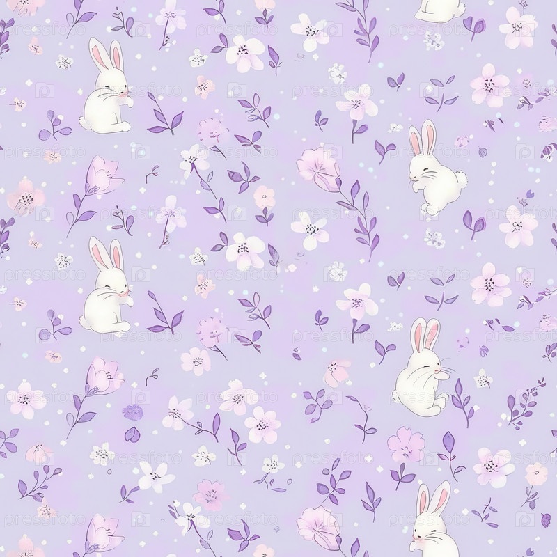 Лавандовый фон с белыми зайцами, нежные цветочные ветви и рассеянные бабочки, бесшовный repeat pattern для детской ткани и подарочной упаковки, мягкий пастель