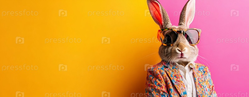 Красочно одетый кролик в солнцезащитных очках позирует на розовом и зеленом фоне, куртка с тропическим принтом, расплывчатые уши, гладкий стиль, студийное освещение