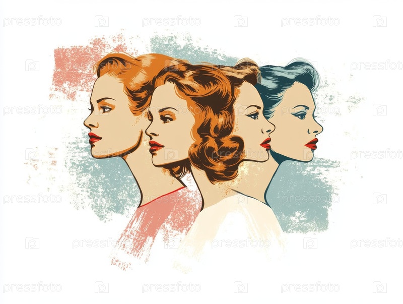 Линия женщин в профиле с определенными выражениями лица и излучающими полосами, винтажная палитра, передающая устойчивость поколений к раковым клеткам, визуальный