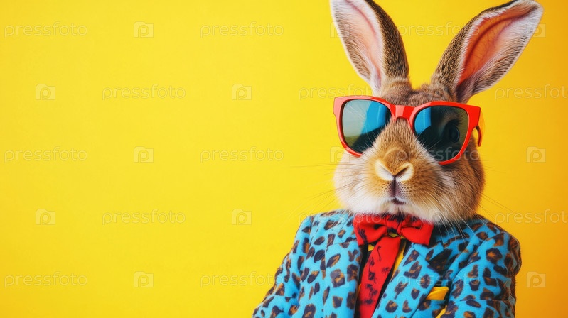 Стильный кролик, уверенно одетый в красочную одежду и шикарные солнцезащитные очки. модный зайчик, одетый в яркую одежду, дополненную модными очками на живом фоне