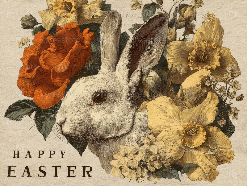 Винтажный пасхальный кролик, расположенный среди цветов, пастельный букет пионки, гортензии, розы, текстурированного гравированного стиля, теплая сепия-палитра, счастливое Пасхальное поздравление