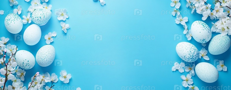 Пасхальные яйца и белые вишневые цветы на ярко-синем фоне