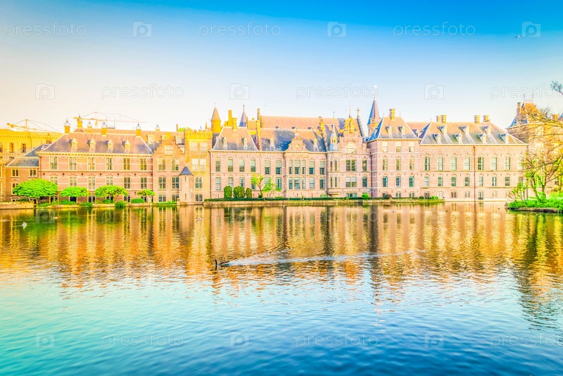 Фасад Binnenhof - Нидерландский парламент с отражениями в пруду Hofvijver, Гаага, Голландия