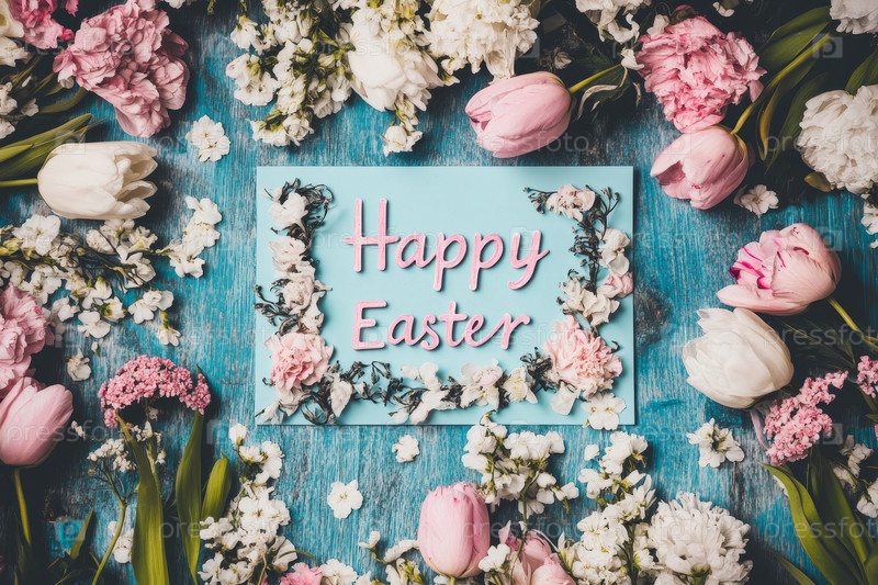 Рукописная открытка "Счастливой Пасхи" в окружении цветочных украшений