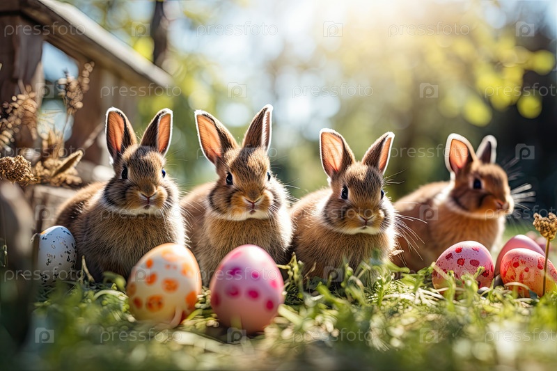 Милые пасхальные кролики среди цветных яиц в корзинах на зеленой лужайке в солнечный день