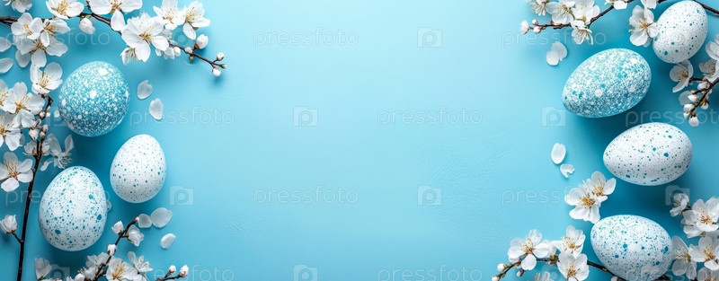 Пасхальные яйца и белые вишневые цветы на ярко-синем фоне. концепция "Счастливого Пасхи"; простой весенний шаблон, поздравительная открытка, баннер. lue