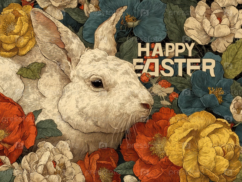 Ретро Пасхальный кролик. старомодный пасхальный зайчик среди пышного цветочного кластера в мягких оттенках. винтажный пастырский кролик, расположенный внутри массива деликатных весенних цветных рисунков