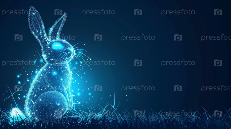 Маленький кролик с украшенными пасхальными яйцами на траве ночью