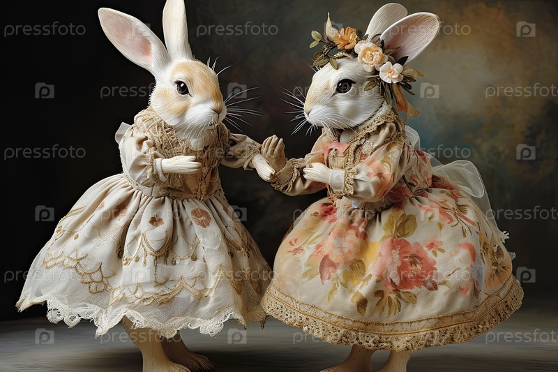 Два танцующих кролика в винтажных платьях, пасхальная концепция