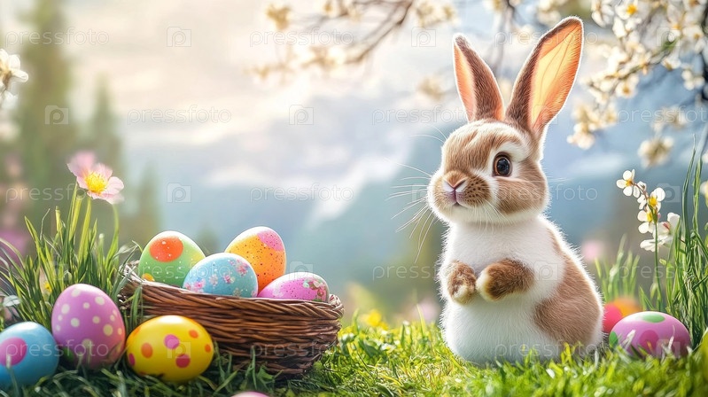 Милый пасхальный кролик с красочными яйцами в гнезде на весеннем фоне природы
