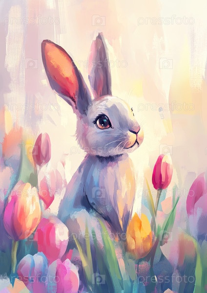 Пасхальный кролик, окруженный тюльпанами в стиле яркой акварельной живописи с пастельными цветами