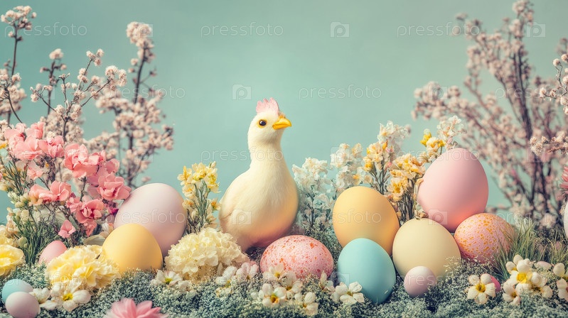 Спокойная и спокойная сцена гнездования с красочными яйцами и очаровательной птицей среди ярких цветов