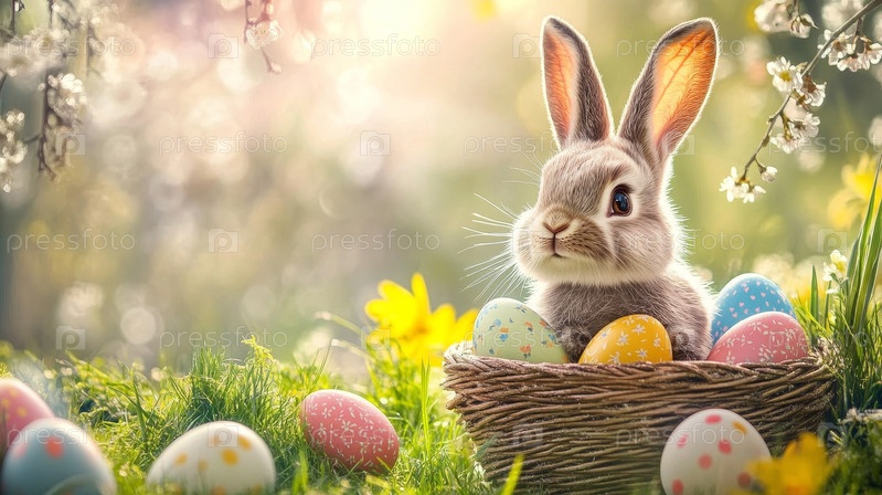 Милый пасхальный кролик с красочными яйцами в гнезде на весеннем фоне природы