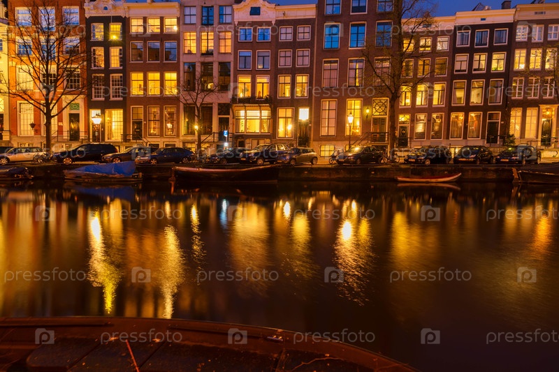 Типичные голландские дома с освещенными окнами над каналом со отражениями ночью, Амстердам, Нидерланды