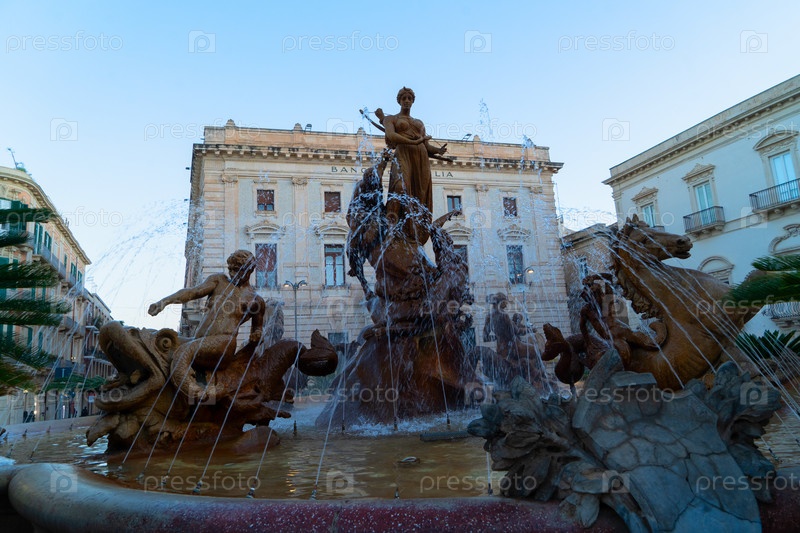 Сиракузская старая средневековая городская улица с фонтаном Дианы, Сицилия Италия