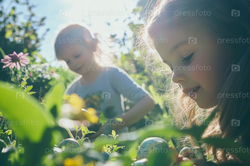 Дети участвуют в охоте на пасхальные яйца в солнечном саду