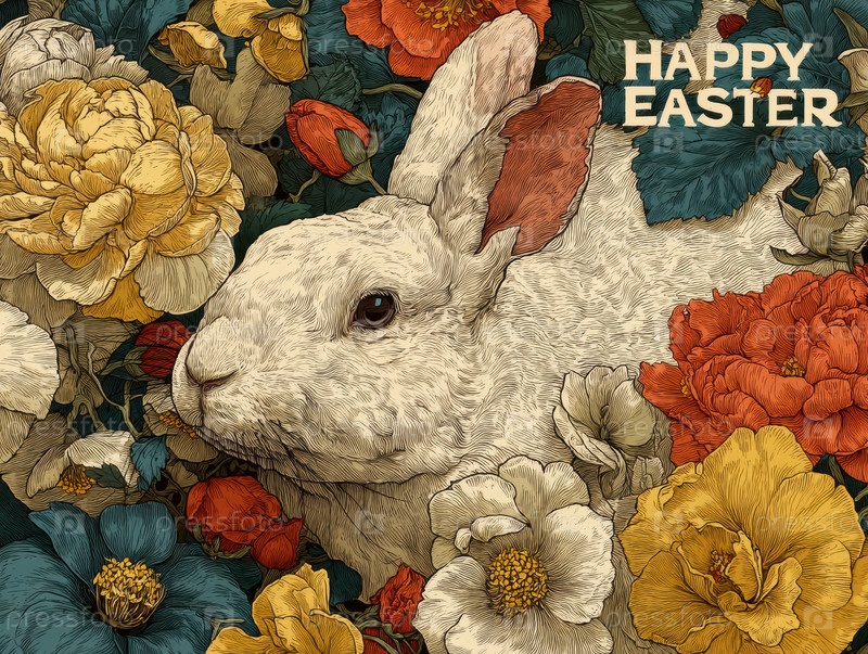 Винтажный пасхальный кролик, расположенный среди цветов, пастельный букет пионки, гортензии, розы, текстурированного гравированного стиля, теплая сепия-палитра, счастливое Пасхальное поздравление